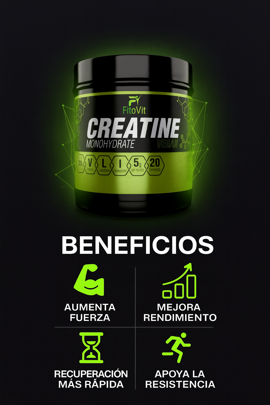 Con Creatina Monohidratada Fitovit, optimiza cada sesión y avanza hacia tus metas con un suplemento confiable, efectivo y pensado para deportistas colombianos que exigen calidad y resultados. ¡Aumenta tu rendimiento con la mejor fórmula vegana del mercado!